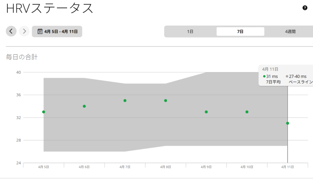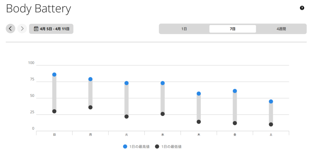 BodyBatteryも週後半に向けて下降しています。忙しい時期は平日頑張って、休日に疲労を持ち越してしまっていることが分かります。水曜日は忙しい日でもサウナに行くなど休息をいれるようにしてみたいと思います。