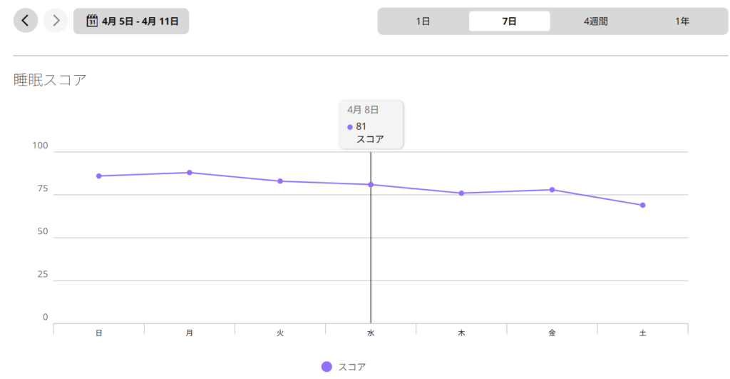睡眠スコア80以上、BodyBattery 76以上(起床時) 30以上(就寝時)を目標にしています。