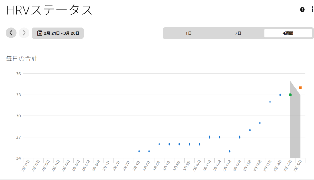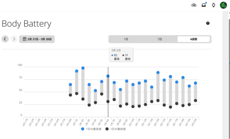 ・Body Batteryはまだ波がある(ただし好調日は90以上の日もある)